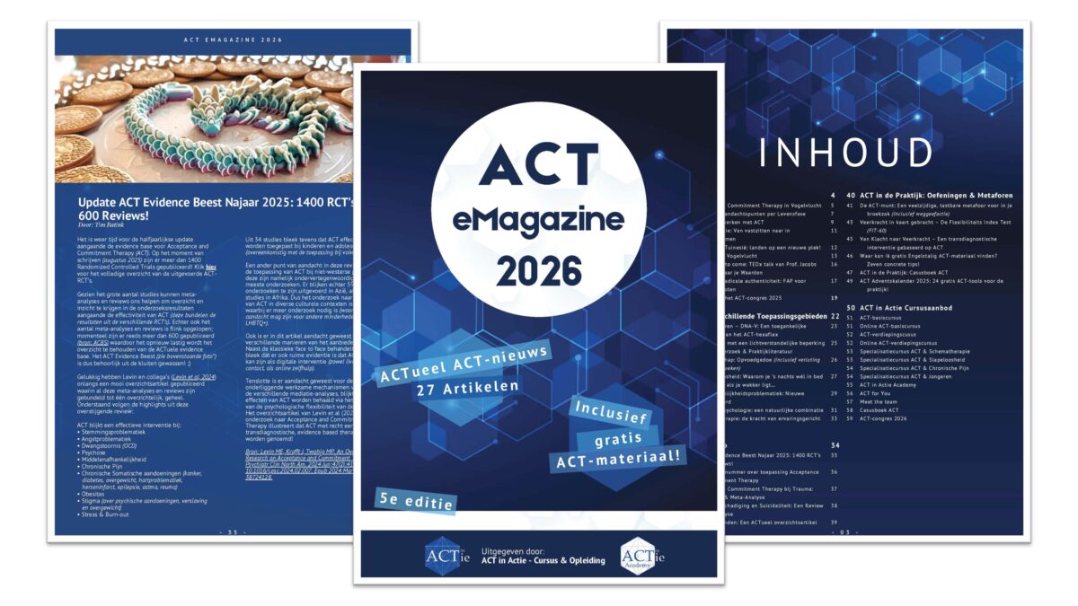 Ben je benieuwd naar de nieuwste inzichten, toepassingsgebieden en praktische tools op het gebied van Acceptance and Commitment Therapy (ACT)? Het gloednieuwe ACT Magazine 2026 biedt het allemaal! Deze vijfde editie bundelt 27 toegankelijke artikelen van verschillende ACT-experts, thematisch verdeeld over verschillende interessante onderwerpen (inclusief gratis ACT-tools).