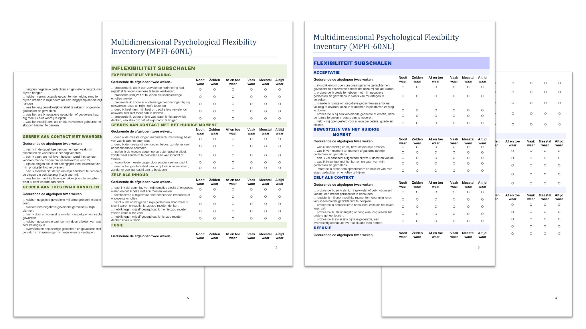 ACT-founder Kelly Wilson heeft in 2016 tezamen met een aantal collega’s een ACT-vragenlijst ontwikkeld: de Multidimensional Psychological Flexibility Inventory (MPFI). De MPFI is een ACT-vragenlijst die alle 12 processen van psychologische flexibiliteit (PF) en inflexibiliteit (PI) uit de ACT-hexaflex meet. De MPFI is ontworpen voor procesgerichte evaluatie: inzichtelijk maken welke specifieke ACT-processen bij een persoon aandacht vragen, alsook het monitoren van interventie-effecten per proces. Uit onderzoek blijkt dat – hoewel er duidelijke onderlinge samenhang is – PF en PI verschillende constructen zijn. Het zijn dus niet simpelweg elkaars tegenpolen en ze kunnen onafhankelijk van elkaar ontwikkelen.